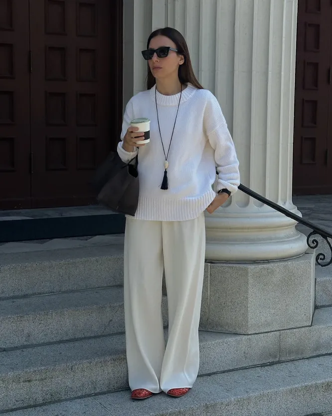 Ни один осенне-зимний образ не обходится без акцентов, и трикотажные аксессуары здесь выходят на первый план. Широкий шарф не только защитит в ветреную погоду, но и с успехом заменит высокий воротник. Практичный и стильный прием — подобрать шарф в тон свитеру или верхней одежде, чтобы собрать комплект в единое целое. Избегайте изделий с люрексом и прочими декоративными элементами — шарф должен гармонировать с большинством ваших аутфитов. Гетры утепляют щиколотку и помогают сохранить баланс в образе с балетками или лоферами. Отдавайте предпочтение моделям без выраженного ворса, они должны сидеть свободно и мягко драпироваться на ноге. Цвета для обоих аксессуаров могут быть как нейтральными, так и насыщенными — при условии, что они сочетаются с остальными элементами образа.