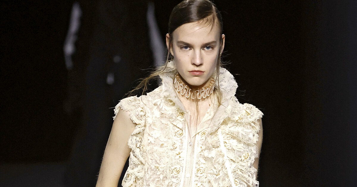 Хотя отголоски этого направления можно было найти и раньше (например, в образе Ланы Дель Рей на Met Gala в 2024 году), именно на последних показах осенне-зимних коллекций тренд оформился максимально четко. Chloé, Who Decides War, Alexander McQueen, Dilara Findikoglu и Andreas Kronthaler for Vivienne Westwood представили в свежих линиях эталонные вещи в духе beige goth — модели из кружева и тафты призрачных оттенков, которые доказывают: готика может быть не только мрачной, но и утонченно-светлой.