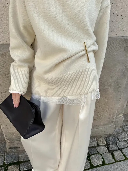 Один из самых трендовых способов создать многослойный образ — набросить на плечи джемпер. Соедините его рукава крупной брошью — она должна быть достаточно массивной, чтобы надежно зафиксировать части изделия. Этим же аксессуаром можно закрепить трикотажное изделие на талии, подчеркнув фигуру. Если же, например, вы надеваете свитер поверх футболки, но ее не видно, то просто приподнимите край верхнего предмета гардероба с помощью броши, открыв второй слой.
