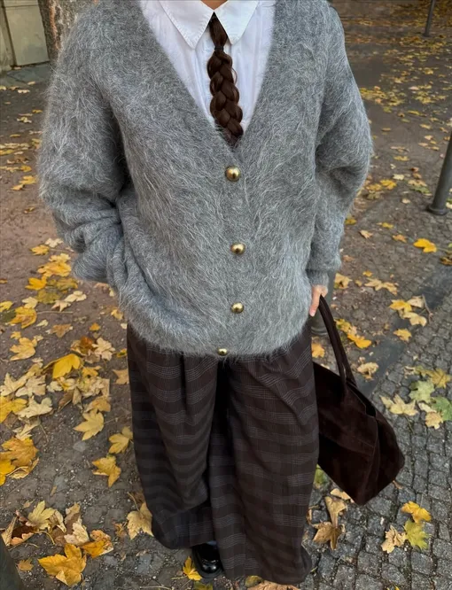 В основе многослойность и натуральные материалы: объемный вязаный кардиган, надетый поверх рубашки, мягкие льняные брюки, стоптанные лоферы. Оттенки — приглушенные, словно выцветшие: охра, оливковый, шоколадный.