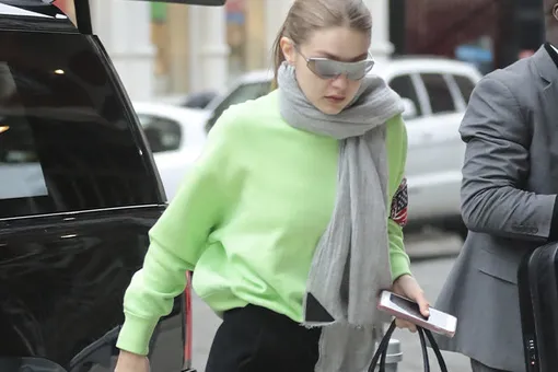 Для повседневного выхода модница выбрала неоново-зеленый свободный свитер, который заправила в черные укороченные скинни с высокой посадкой. Если обычно с такими брюками надевают подследники или низкие носки, то Джиджи решила пойти против правил. Модель любит модные эксперименты, которые не редко становятся трендами. Так что не исключено, что высокие носки с укороченными брюками скоро начнут носить ее последовательницы. Свой образ она дополнила шарфом, повязав его вокруг шеи, черной крупной сумкой и солнцезащитными очками из своей коллаборации с Vogue Eyewear.