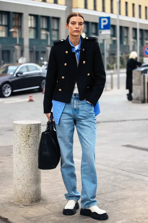Купить подходящий жакет — это еще не все. Важно правильно его стилизовать. Сочетайте такой верх с базовыми вещами. Например, облегающими джинсами в духе 2000-х, буткатами или прямыми денимовыми парами. Подойдут и прямые юбки из шерсти или хлопка. Только откажитесь от асимметричных моделей или фактурных вариантов. Чтобы собрать дерзкий «рокерский» образ, «мундир» можно дополнить гладкими кожаными брюками или гранжевым полупрозрачным платьем с воланами. От чего точно стоит отказаться, так это от строгого низа в классическом стиле. В сочетании с ним жакет будет выглядеть чересчур парадно.