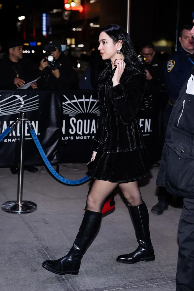 Папарацци запечатлели Липу, когда она вместе с друзьями отправилась на игру Knicks. Образ артистки можно было бы назвать удачным, ведь она надела приталенный жакет — такие, судя по стритстайлу и недавним Неделям моды, становятся более популярными, чем оверсайз-варианты, — добавив к нему короткую плиссированную юбку. Миди действительно постепенно выходят из моды — это касается и платьев, и юбок.