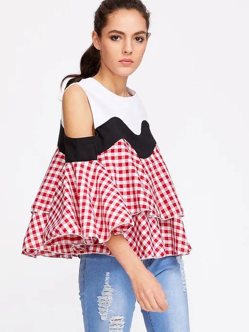 Насколько удобно двигаться в топе с крупными воланами, сковывающем движения, судить сложно, но накинуть жакет или куртку сверху, если замерзнут плечи, будет еще сложнее.
