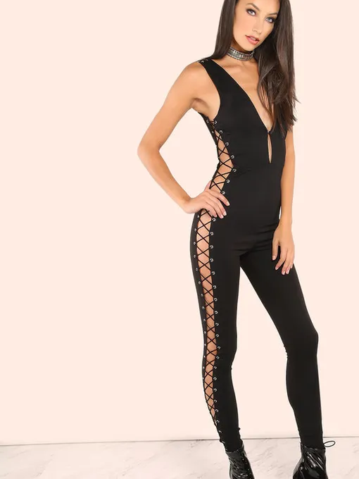 Мало того, что подобного рода брюки, платья и комбинезоны с боковыми шнуровками,обнажающими тело, мы не рекомендовали бы носить никому, кроме Рианны, так еще и не вполне понятно, что делать с нижним бельем, надевая подобную модель. Да,существуют сложные конструкции, предназначенные для красных ковровых дорожек, но мы же живем в реальной жизни.