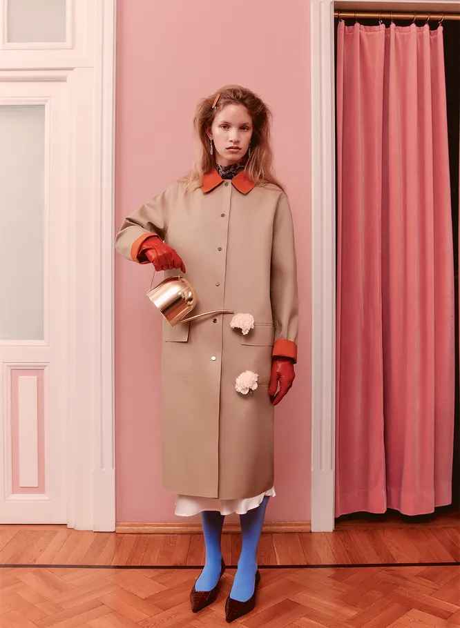 Шелковая сорочка, Togas; рубашка из шифона, Guess; двусторонний макинтош из техноткани, Iceberg; колготки из полиамида, Falke; кожаные туфли, Principe Di Bologna, No Оne; кожаные перчатки, TJ Collection; серьги из белого и розового золота с турмалинами, сапфирами и бриллиантами, Cluev