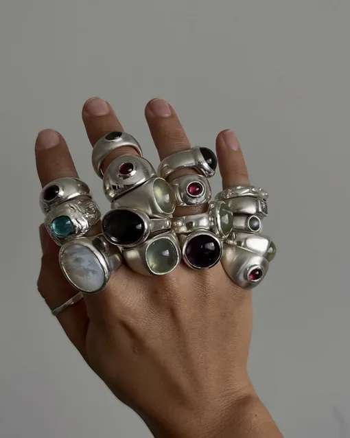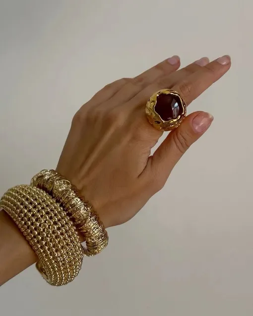 Доминируют ультраобъемные изделия. На пике популярности именно кольца с крупными цветными кристаллами, но не с классической огранкой, а кабошоны. При такой обработке камень становится гладким и выпуклым. Выбирайте насыщенные природные оттенки: изумрудный, хаки, темно-синий, теплый медовый, броновый. Оправа у подобных украшений — массивная, дутая, с выраженной фактурой, часто всевозможных причудливых форм, например, в виде цветка или даже кляксы. Не теряют актуальности кольца-печатки с резным орнаментом и широкие металлические «обручи» без вставок. Приветствуется максимализм: на одной руке стоит комбинировать сразу несколько таких выразительных колец.