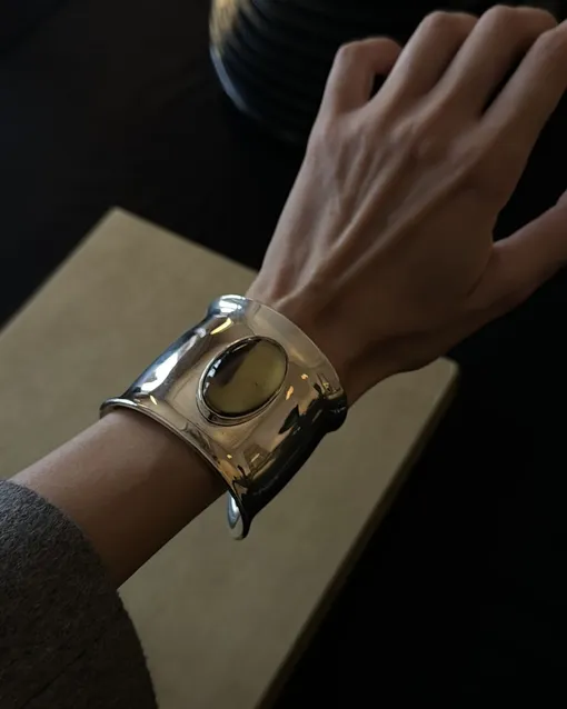 В тренде жесткие браслеты-манжеты из металла, которые могут быть как гладкими, так и покрытыми сложным выпуклым орнаментом. В ходу и другие материалы. Популярны массивные изделия из цветной эпоксидной смолы с сухоцветами, перламутром или мелкими кристаллами.