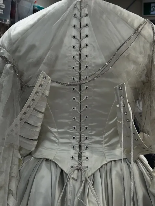 Но, конечно, больше всего внимания Хоули уделила свадебному платью. «Я поиграла с историческими отсылками, такими как швейцарские ленточные корсажи, а затем мы воплотили это в жизнь. Это трехслойное платье. Есть ленты, есть еще один маленький жакет, основа в которых швейцарско-немецкий традиционный костюм, а затем швейцарский лиф сверху. Это почти как рентгеновский снимок. Затем, в самом конце, когда начинается кровотечение, это возвращает вас к моменту с матерью», — отметила художница по костюмам. Белые органза и тюль, пропитанные кровью, сопровождают одну из главных мыслей о том, что порой смерть — это подарок, особенно для тех, кто как чудовище Франкенштейна или сама Элизабет вряд ли действительно могут существовать в этом мире.