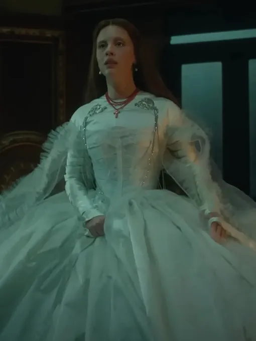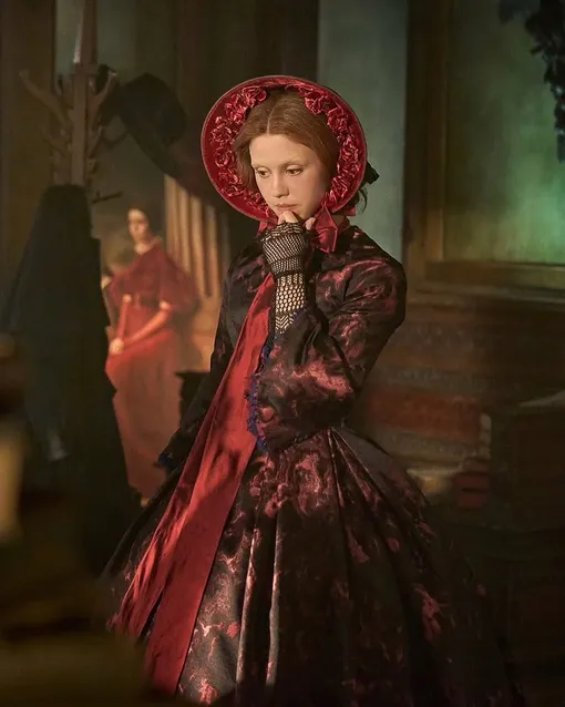 Элизабет, наверное, единственный персонаж, у которого крайне разнообразная цветовая палитра. Перед зрителем она появляется в оттенках самых разных драгоценных камней, а заодно моментально притягивает внимание в любом кадре. И это неспроста — художница по костюмам Кейт Хоули превращает моральный центр, которым является героиня Мии Гот, в визуальный. Изумрудно-зеленое, синее и даже темно-красное платья в сочетании с потрясающими аксессуарами выглядят великолепно.