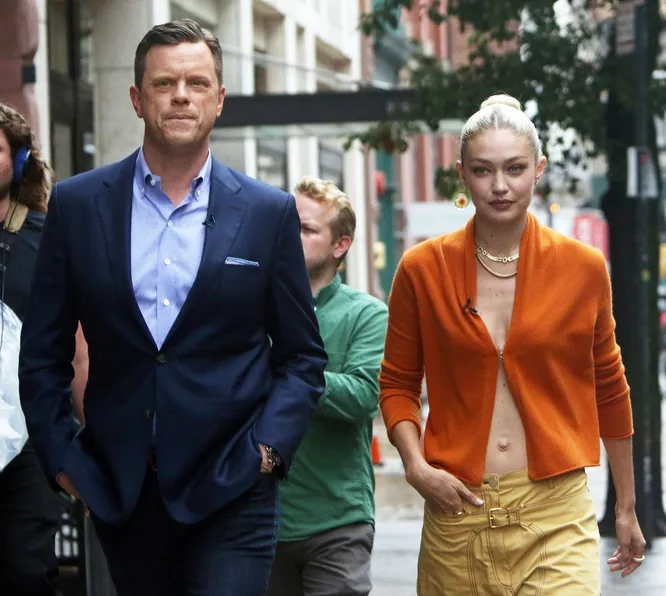 На днях модель застали во время съемок. Она выбрала яркий аутфит, который способен раскрасить осенние будни. Оранжевый кардиган, застегнутый лишь на одну пуговичку, звезда срифмовала с желтыми брюками на низкой талии. Такой низ привлекает достаточно много внимания и сместит акцент.