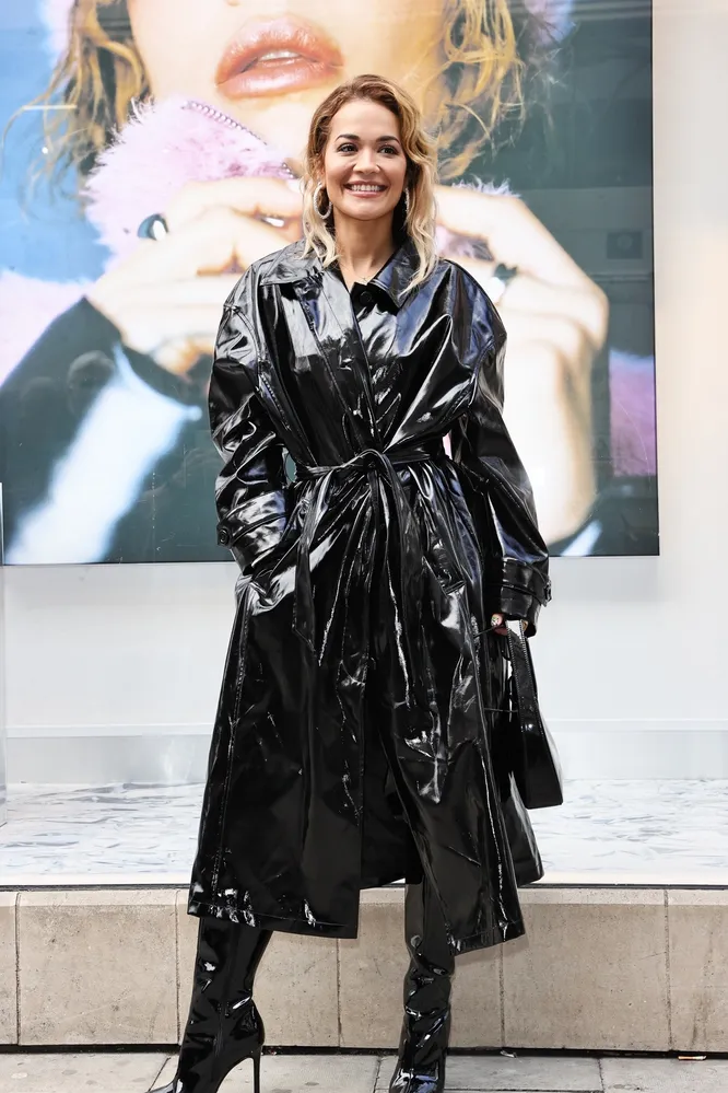 Теперь Рита примерила тотал-лук из винила. Она надела черное виниловое пальто лаконичного кроя с поясом, а дополнила его высокими черными сапогами из того же материала. Обратите внимание на то, что в этом лаконичном комплекте винил вовсе не смотрится вульгарно или вызывающе. На это есть ряд причин — во-первых, «успокаивающее действие» оказывает спокойный крой, а во-вторых, свое влияние есть и у черного цвета.