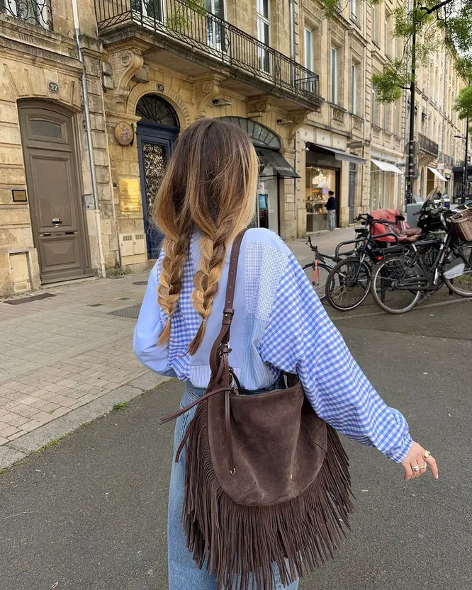 Прелесть тренда — в его универсальности. Бахрома уместна практически на любой модели. На пике популярности — мягкие бесформенные изделия: тоуты и хобо, «оживленные» такой отделкой. Не менее востребованы практичные и вместительные кросс-боди с широким ремнем, отсылающие к эстетике бохо. Современные топ-хендлы и багеты также поддерживают тенденцию. Они особенно эффектно смотрятся с нитями, свисающими почти до пола. Этот декор идеально сочетается с актуальными массивными клатчами, мешочками и узелками, превращая их в главный акцент образа. Однако на строгих каркасных сумках и саквояжах обилие бахромы может выглядеть неуместно. В таком случае рекомендуем рассмотреть аксессуары, украшенные не россыпью лент, а несколькими выразительными кистями.