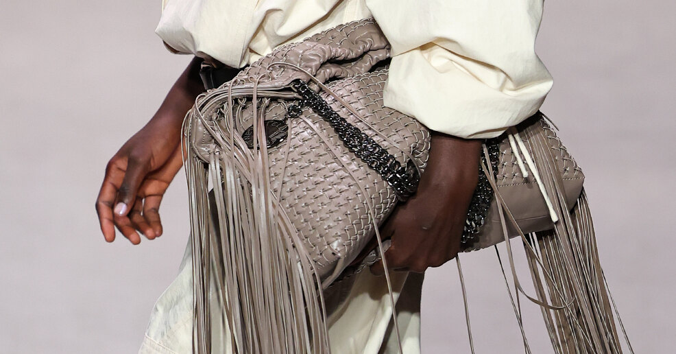 Прелесть тренда — в его универсальности. Бахрома уместна практически на любой модели. На пике популярности — мягкие бесформенные изделия: тоуты и хобо, «оживленные» такой отделкой. Не менее востребованы практичные и вместительные кросс-боди с широким ремнем, отсылающие к эстетике бохо. Современные топ-хендлы и багеты также поддерживают тенденцию. Они особенно эффектно смотрятся с нитями, свисающими почти до пола. Этот декор идеально сочетается с актуальными массивными клатчами, мешочками и узелками, превращая их в главный акцент образа. Однако на строгих каркасных сумках и саквояжах обилие бахромы может выглядеть неуместно. В таком случае рекомендуем рассмотреть аксессуары, украшенные не россыпью лент, а несколькими выразительными кистями.