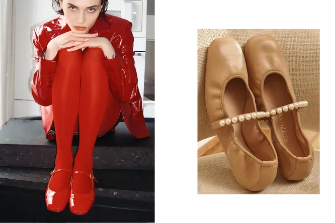 Важен и материал. Балетки из лаковой кожи, похожие на туфли Лолиты из одноименного фильма, сделают образ более игривым. А вот изделия из матового материала или замши, наоборот, выглядят утонченно. В 2024-м особенно актуальны пары из атласа. Они напоминают танцевальную обувь и отсылают к трендовой эстетике.