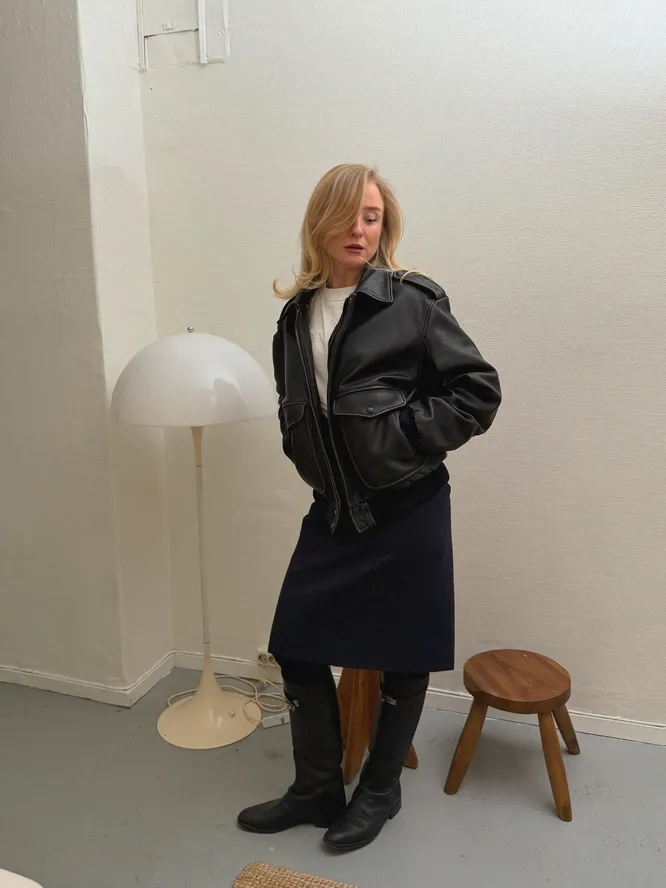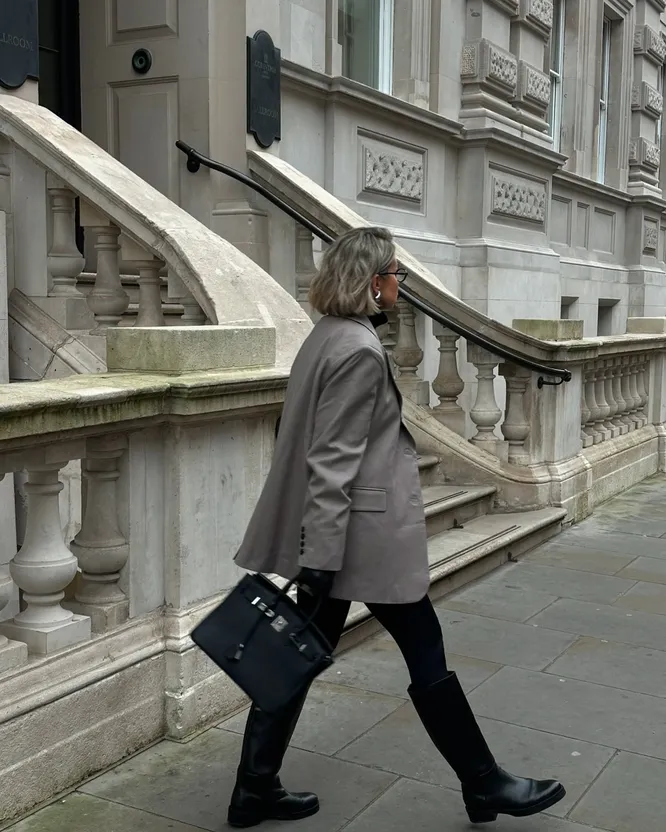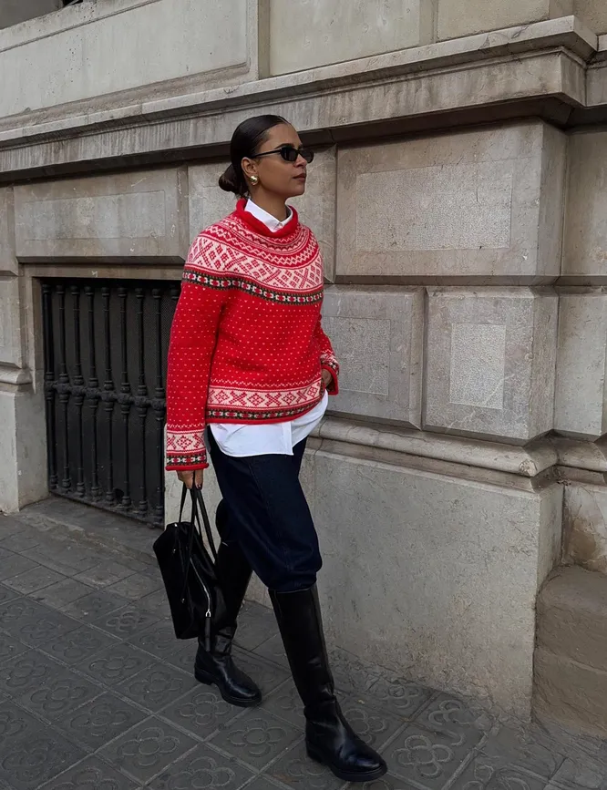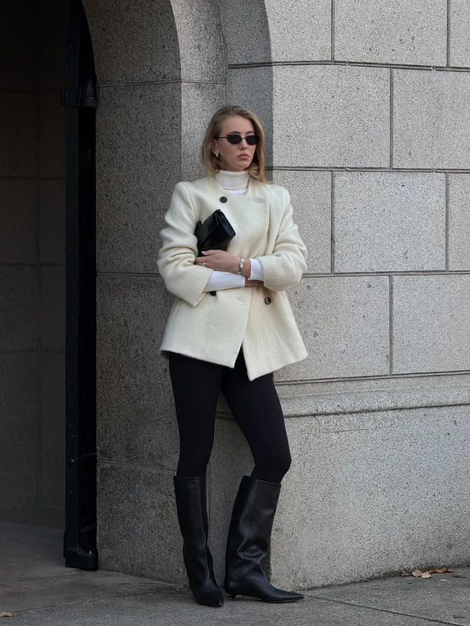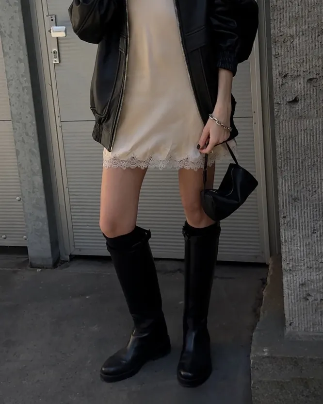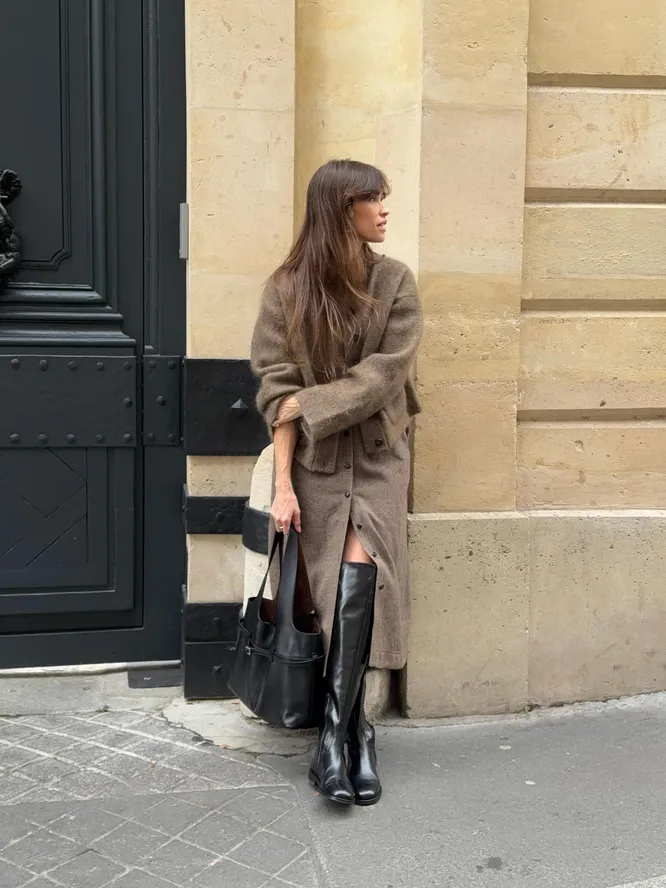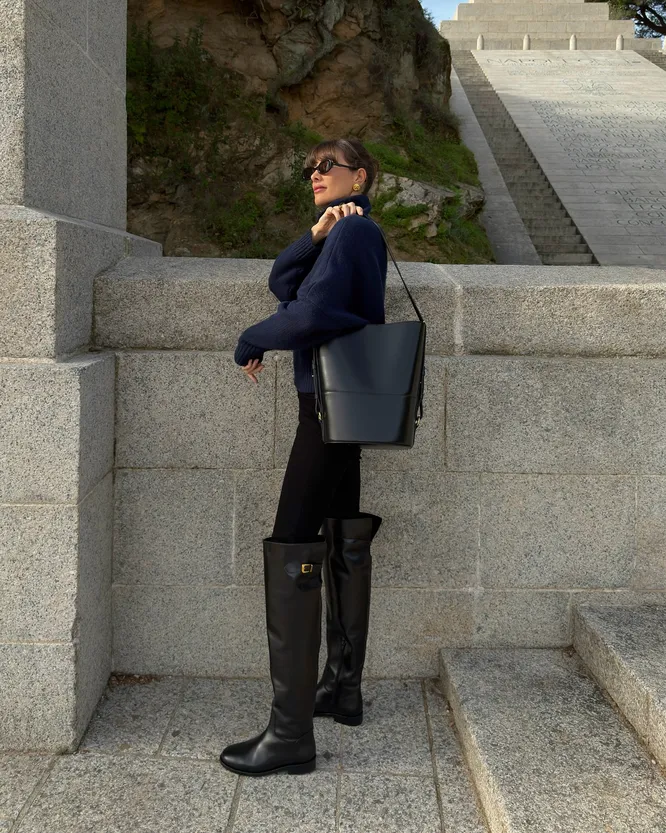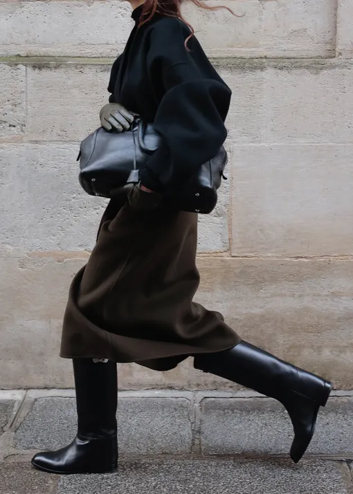 Главное правило — сапоги должны быть прямыми или слегка расширенными кверху. Важно, чтобы голенище не облегало ногу, но при этом и не оставалось слишком много пустого пространства вокруг голени. Золотая середина здесь становится залогом универсальности: такие пары можно носить как с юбками и платьями, так и с любыми брюками или джинсами. Идеальная высота — до колена или на пару сантиметров ниже, чтобы ничего не мешало движению. Шпилька уступает место устойчивому каблуку: подойдет аккуратная рюмка, kitten heel или невысокий блок. Можно выбрать и плоский ход, но в этом случае следите, чтобы подошва не была слишком массивной. Что касается мыса, то в моде два основных варианта: заостренный, который визуально удлиняет стопу, и трапециевидный с четким прямым срезом. Круглый нос тоже допустим, но он проигрывает первым двум в выразительности.