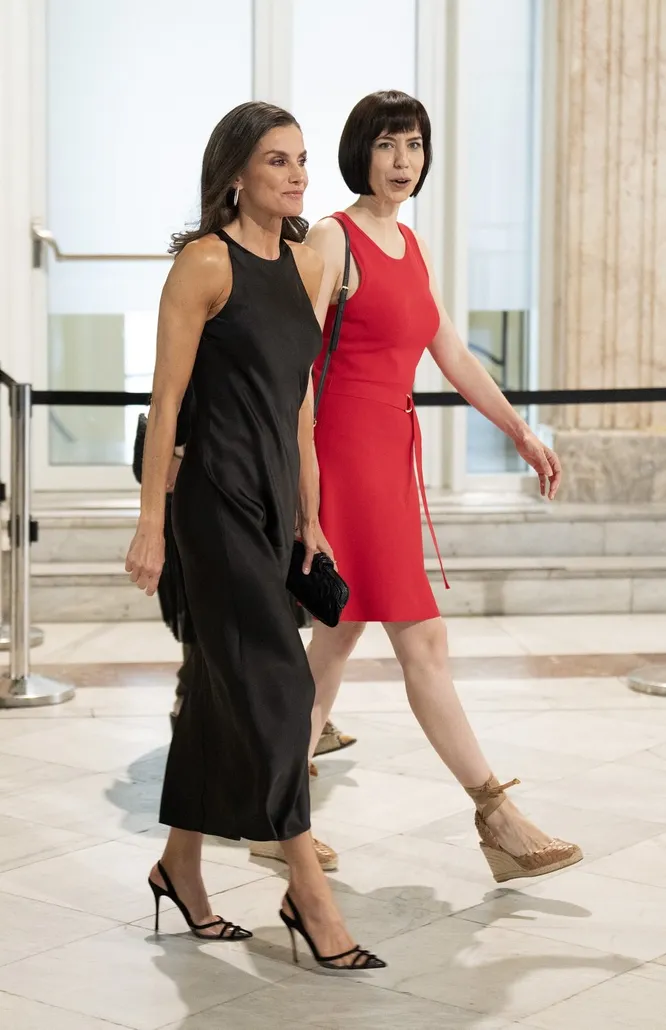 На научное мероприятие, проходившее в Мадриде, королева надела черное макси в бельевом стиле со слегка расклешенной юбкой. Дополнением ее наряда стали лодочки с прозрачными вставками. Мы искренне советуем обратить внимание на это платье всем женщинам, которые переживают, что платья-комбинации будут смотреться вульгарно или вызывающе в их возрасте.