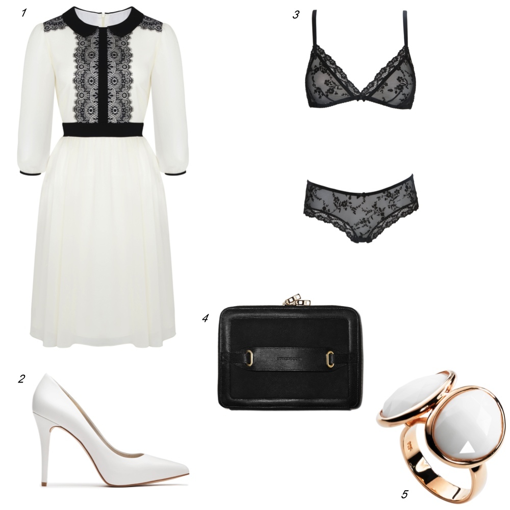 На первый взгляд, черно-белый наряд может показаться чересчур закрытым и строгим, но ажурная вставка и приталенный крой придают ему торжественности и утонченности.