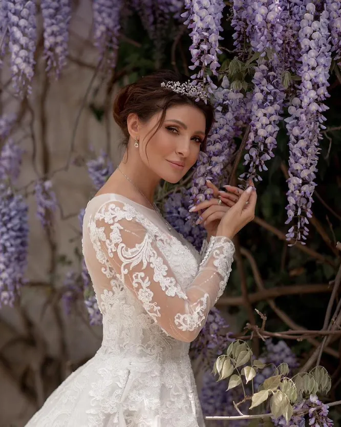 Церемонию влюбленные решили организовать в Крыму. Ранним утром звезда мюзиклов опубликовала на своей странице в Инстаграме (Социальная сеть признана экстремистской и запрещена на территории Российской Федерации) фотографии, на которых она предстала в сказочном наряде невесты. Верх платья выполнен из изящного кружева, а пышный подол имеет длинный шлейф. Голову артистки увенчала тиара со сверкающими камнями.