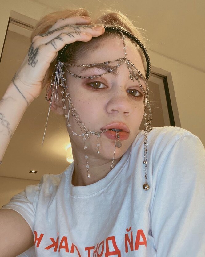 Возлюбленная изобретателя-миллиардера Илона Маска поделилась снимками, на которых она запечатлена с ярким макияжем, необычным украшением на лице и в футболке от российского бренда «Спутник 1985», на которой кириллицей напечатано: «Ай донт лайк».