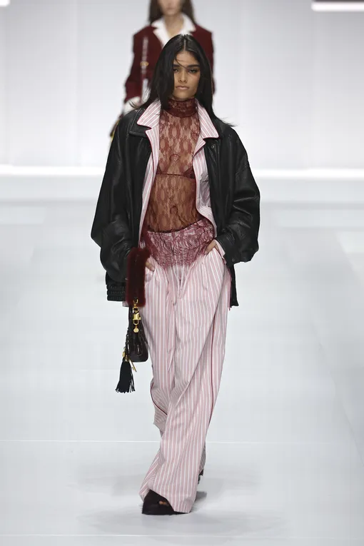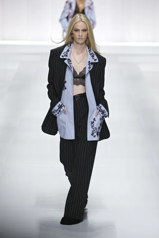 Лейтмотив коллекции — принт-вертикальная полоска. В следующем сезоне в тренде будут несколько вариантов этого орнамента. Первый — тонкие линии в ахроматических черном, сером и белом оттенках. Такой узор ассоциируется с костюмами и офисным гардеробом. Второй вариант больше отсылает к пижамной эстетике — речь о крупных полосах в пастельных оттенках. Самое популярное сочетание в этом случае — голубой с белым и сочетание оттенков розового. Кстати, в 2026-м этот классический орнамент можно смело рифмовать с цветочным.