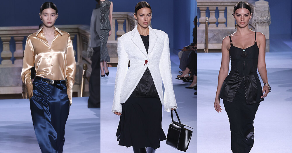 Ирина вышла на подиум в комплекте с миди, который дополнял белый пиджак. В таких образах жакет обычно выполнен в стиле оверсайз, но бренд решил сделать ставку на приталенную удлиненную модель с одной пуговицей — такие мы носили в середине 2010-х. Образ Эмили тоже не обошелся без модных отсылок к прошлому. Модель показала сексапильное корсетное платье с атласной баской. Эту деталь мы решительно вычеркнули из гардероба 10 лет назад, но теперь ее явно ждет модное возрождение — баска появилась в каждом втором образе.