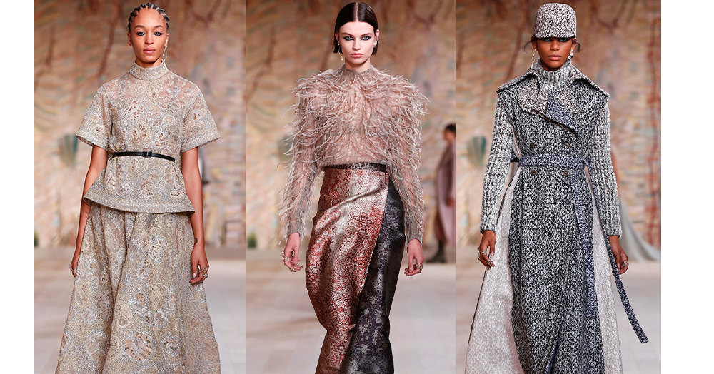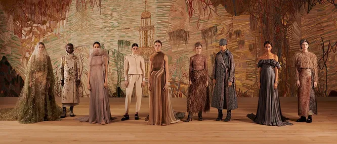 Показ кутюрной коллекции Dior в рамках Недели высокой моды в Париже прошел в Музее Родена. Модели дефилировали на фоне огромного тканного полотна, созданного художницей Евой Жоспин. Цветовая гамма повторяла палитру образов: телесный, шоколадный, серый, травяной зеленый, светло-голубой, молочный.