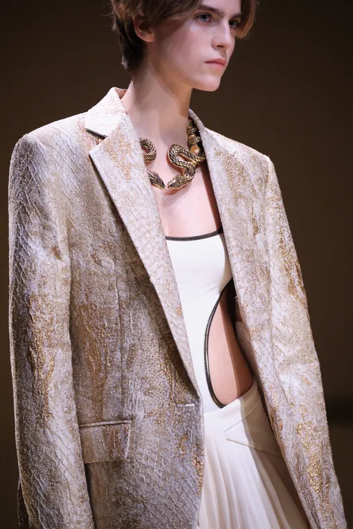 Главными героями новой весенне-летней коллекции бренда, как уже упоминалось, стали вещи со змеиным принтом. Этот орнамент украсил облегающие платья, мини-юбки, полупрозрачные блузы, жакеты и брюки. Ключевая особенность — рисунок, который кажется едва заметным. Выполненный в золоте или металле, он скорее напоминает легкое тиснение, чем четкий контрастный узор.