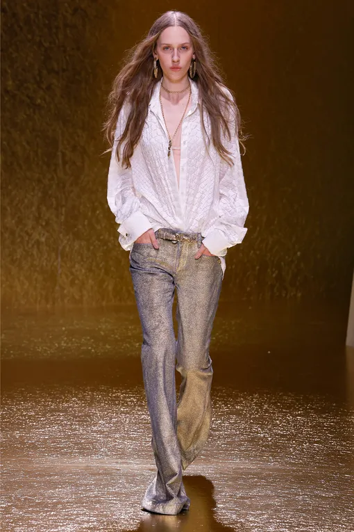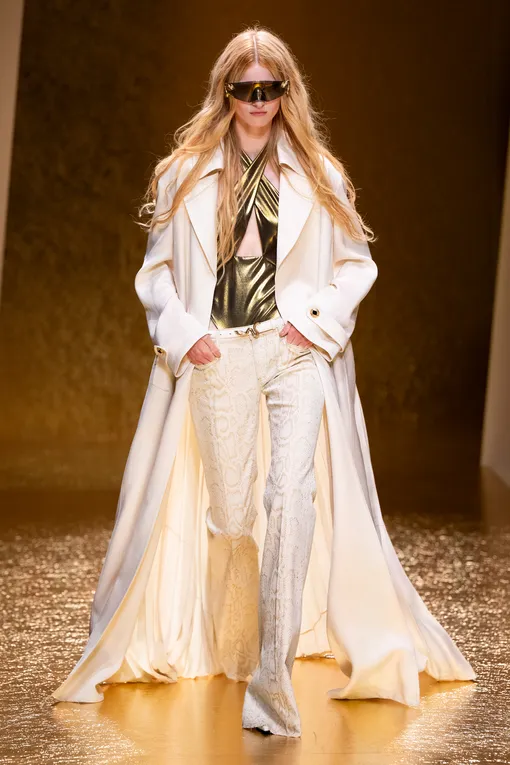 Мы выделили в коллекции и отсылки к эстетике бохо. Это один из ключевых трендов этого года, но в следующем сезоне богемный стиль точно не сдаст своих позиций. Roberto Cavalli представили струящиеся платья из легких тканей, которые дополнили массивными кулонами-амулетами. Еще один элемент, отсылающий к бохо, — расклешенные брюки на низкой посадке. Они триумфально возвращаются к нам из 2000-х, подтверждая, что мода на ностальгию тоже будет только набирать обороты.