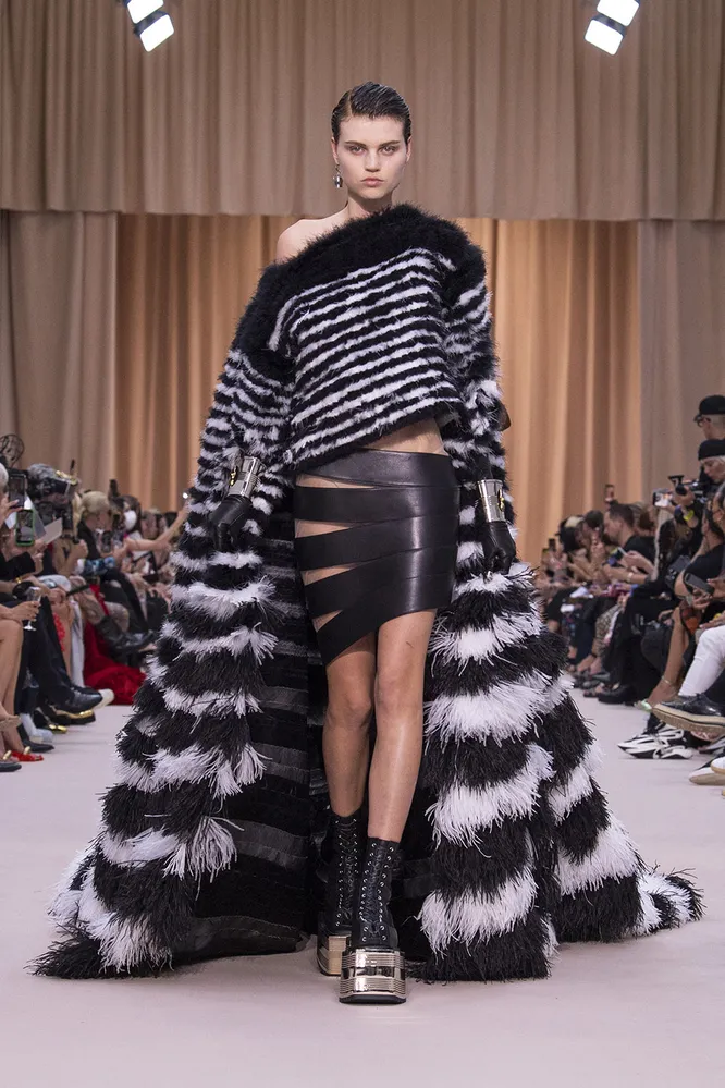Оливье Рустен сохранил ДНК французского модного Дома — на подиуме можно было заметить корсетные платья с бра конической формы и культовую тельняшку, которую дополнил принт, напоминающий татуировки. Не обошлось и без максимализма — в коллекции появилось платье с перьями и гипертрофированными рукавами строгих геометричных форм. Хоть большинство вещей выполнены в приглушенных тонах, есть и цветные акценты — макси в самых трендовых оттенках фуксии и электрик. А вот всевозможные оборки и драпировка на нарядах — отличительная черта Оливье Рустена, который часто использует такой прием при создании собственных линеек.