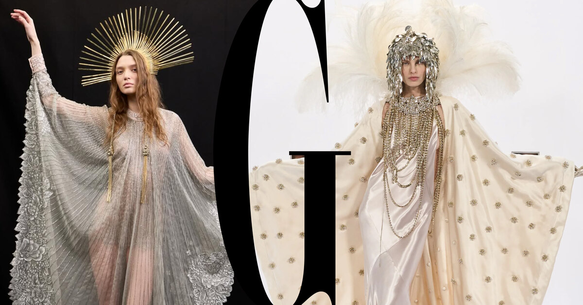 Следующая «остановка» — золотой век Голливуда, к которому питал страсть сам Гаравани. Многие образы напоминали луки кинодив прошлого — модели дефилировали в платьях в пол со шлейфами, драматичными вырезами, подчеркнутой линией плеч и длинными перчатками. Наряды выглядели так, словно были созданы не только для подиума, но и для красной дорожки или съемок ретро-фильмов. Например, сияющее бело-серебряное платье в пол с бахромой и меховой отделкой вызывает ассоциации с образом Марлен Дитрих в макси из стекляруса. А роскошные ансамбли с перьями отсылают к ревущим 1920-м и «Великому Гэтсби».