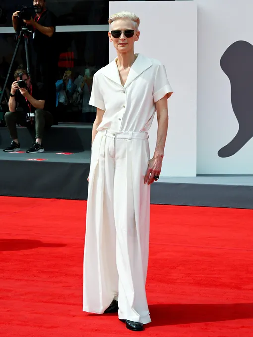 Отметилась на премьере и Тильда Суинтон. Актриса вновь остановилась на лаконичном образе Chanel. На этот раз ее выбор пал на белый брючный костюм с рубашкой с короткими рукавами.