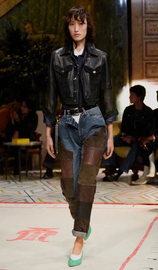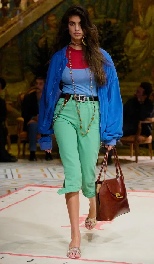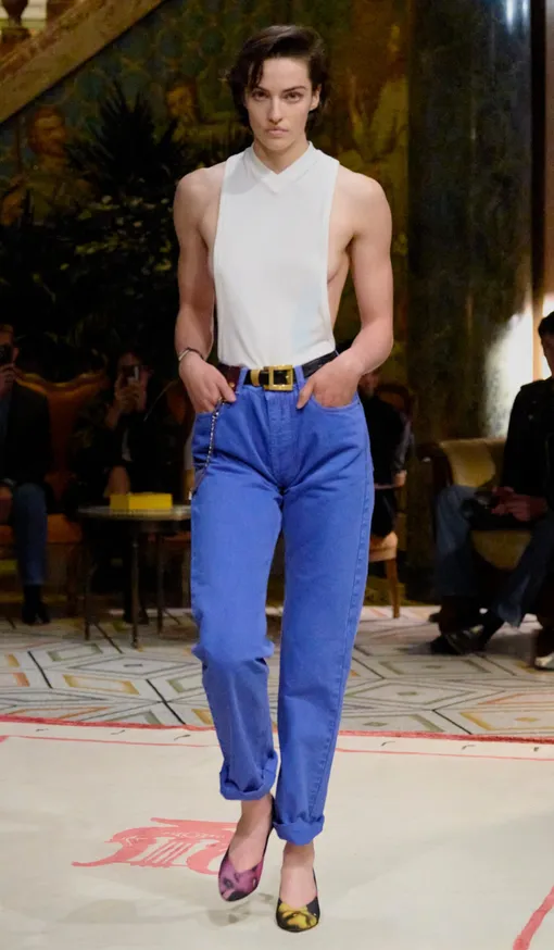 Еще один вернувшийся тренд прошлого — джинсы mom. Мы давно не видели просторный, слегка зауженный книзу, фасон в свежих коллекциях. Versace предлагают не просто осторожно присмотреться к базовым моделям, а сразу начать экспериментировать с их декором. Например, в моде будут денимовые пары с принтом или в технике апсайкл. Последняя, кажется, станет одним из ведущих трендов следующего года — мы уже видеди изделия, созданные из лоскутов разных тканей, у Moschino, Prada и не только.