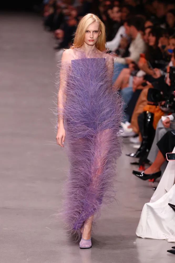 Дизайнер возвращает в моду одежду с перьями. Они должны быть длинными и тонкими, но главный секрет в том, что их пришивают очень близко друг к другу. Этот прием создает иллюзию, будто одежда выполнена из пушистого полотна, а не декорирована отдельными элементами. Именно здесь и проявляется философия бренда: для создания такого эффекта использованы инновационные растительные перья, при производстве которых не пострадала ни одна птица. Еще одной доминантой коллекции стал деним. Бренд предлагает обратить внимание на джинсы и платья, созданные по технологии PURE.TECH, которая, по словам дизайнера, «буквально очищает воздух». Кроме того, многие модели собраны из контрастных лоскутов — это не просто стилистический ход, а апсайклинг.