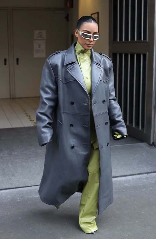 На этом модные эксперименты не закончились! Кардашьян «поймали» в еще одном кожаном тотал-луке. Она срифмовала зеленый жакет с воротником-стойкой с брюками такого же цвета и серым плащом оверсайз.
