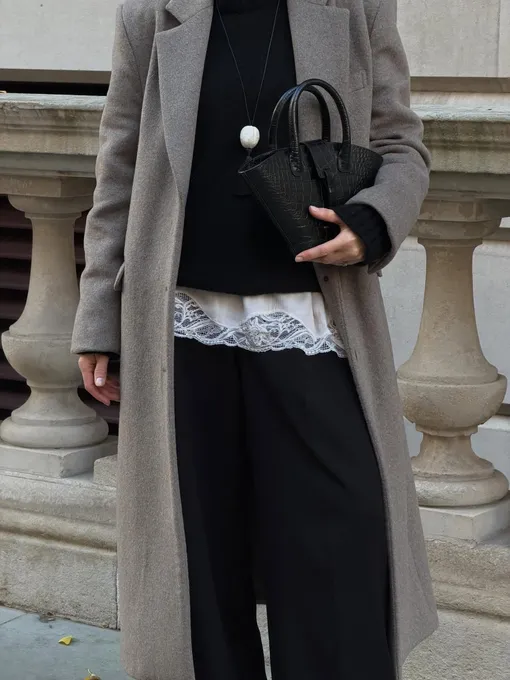 Речь о кружевных перчатках, манжетах или съемных жабо. Эти детали легко вписать в привычные комбинации. Например, ажурные манжеты добавляют к рукавам жакета, рубашки, водолазки, пальто или тренча. Перчатки носят отдельно или поверх обычных в холодную погоду. Жабо моментально делают лаконичный образ запоминающимся. Хотя с последними стоит быть осторожнее: их лучше сочетать с лаконичной одеждой, а не с помпезными платьями. Для создания гармоничного ансамбля можно повторить кружевной мотив в других аксессуарах, например, выбрав сумку с подобными вставками.