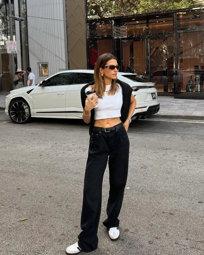 Этот образ идеален для тех, кто хочет выглядеть стройнее. Топ, боди или лонгслив, сидящие по фигуре, подчеркнут силуэт и не добавят ему лишних сантиметров за счет складок. Черный тотал-лук еще и сделает вас визуально выше. Фасон верха в таком образе может быть практически любым. А вот джинсы лучше выбирать базовые – например, прямые или клеши, отказавшись от моделей с объемными карманами и заниженной посадкой. Только следите за тем, чтобы посадка была высокой, а штанины заканчивались не выше щиколотки. В противном случае изделие способно сыграть злую шутку даже с идеальной фигурой.