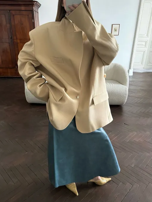 Еще один тренд 2026-го — грязные цвета с серым подтоном. Их можно смело рифмовать между собой. Например, актуальная вариация голубого (она, кстати, напоминает тон пасмурного неба) отлично сочетается с главным цветом года по версии Pantone «Облачный танцор». Особенность этого белого как раз в том, что он не чистый снежный. В нем есть желтоватый и сероватый оттенки, которые и делают его максимально универсальным.