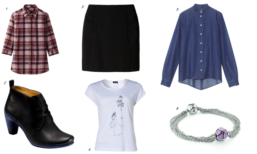1/ Хлопковая сорочка, Uniqlo, 999 руб., Uniqlo; 2/ Ботильоны из нубука, Ecco, 5990 руб., Ecco; 3/ Хлопковая юбка, Gerard Darel, 7100 руб., Gerard Darel; 4/ Топ из вискозы, Daniel Hechter, 4500 руб., универмаг «ХЦ»; 5/ Хлопковая сорочка, Lacoste, 4980 руб., Lacoste; 6/ Серебряный браслет с клипсой из серебра и эмали, Pandora, 5550 и 2350 руб., Pandora