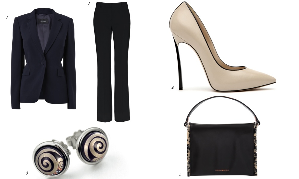 1/ Жакет из полиэстера, Jaeger, 15 050 руб., Jaeger; 2/ Брюки из шерсти и полиэстера, Wolford, 14 405 руб., Wolford; 3/ Металлические серьги с родиевым напылением и эмалью, Freywille, 26 535 руб., Freywille; 4/ Туфли из кожи и металла, Casadei, 37 550 руб., Casadei; 5/ Кожаная сумка, Emporio Armani, 24 000 руб., Emporio Armani