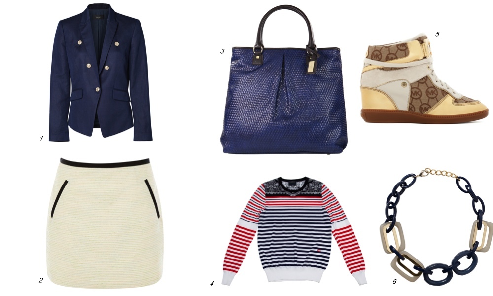 1/ Жакет из хлопка и льна, Mango, 2499 руб., Mango; 2/ Юбка из хлопка и полиэстера, Oasis, 2079 руб., Oasis; 3/ Сумка из искусственной кожи, Pollini, 9000 руб., Pollini; 4/ Хлопковый джемпер, Class Roberto Cavalli, 13 560 руб., ТД «Люкс»; 5/ Кеды из текстиля и кожи, Michael Michael Kors, 9700 руб., Michael Michael Kors; 6/ Колье из пластика и металла, Pennyblack, 4300 руб., Pennyblack