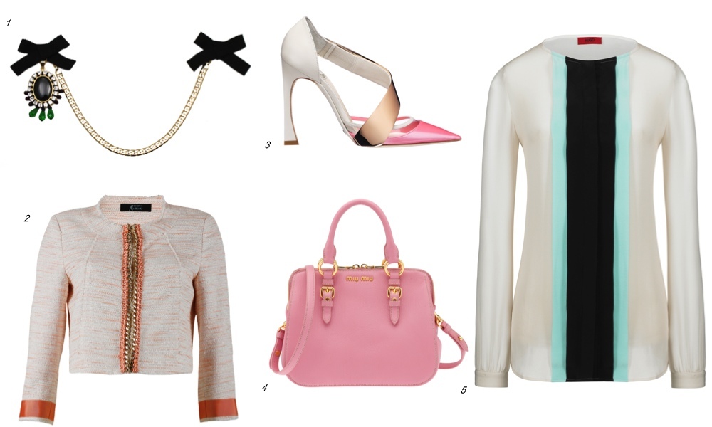 1/ Колье из металла и текстиля с натуральными камнями, Akong, 25 000 руб., Le Premier; 2/ Жакет из хлопка и вискозы, Gues by Marciano, 12 334 руб., Guess by Marciano; 3/ Туфли из кожи и металла, Dior, 41 000 руб., Dior; 4/ Кожаная сумка, Miu Miu, цена по запросу, Miu Miu; 5/ Блуза из вискозы и хлопка, Hugo Boss, 18 500 руб., Hugo Boss