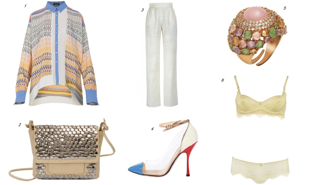 1/ Шелковая блуза, Max&Co, 12 427 руб., Max&Co; 2/ Сумка из кожи и металла, Sonia Rykiel, 26 230 руб., Sonia Rykiel; 3/ Брюки из шелка и льна, Basharatyan V, 13 290 руб., Basharatyan V; 4/ Туфли из лакированной кожи и пластика, Nando Muzi, 13 981 руб., Nando Muzi; 5/ Серебряное кольцо с напылением из желтого золота с празиолитами и халцедонами, Prima Exclusive, цена по запросу, Prima Exclusive; 6/ Бюстгальтер и трусы из шелка и кружева, Ermanno Scervino, 15 869 и 13 299 руб., «Дикая орхидея»
