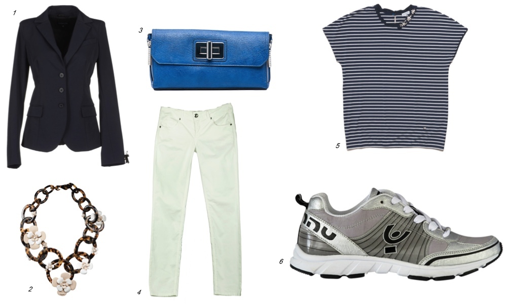 1/ Жакет из полиамида, Patrizia Pepe, 20 700 руб., Patrizia Pepe; 2/ Колье из пластика и металла, Prada, цена по запросу, Prada; 3/ Клатч из полиуретана и металла, Stefanel, 4500 руб., Stefanel; 4/ Хлопковые брюки, Blugirl, 15 167 руб., Blugirl; 5/ Топ из вискозы, Henry Cotton’s, 5520 руб., Henry Cotton’s; 6/ Кроссовки из полиуретана и нейлона, Freddy, 4800 руб., Freddy;
