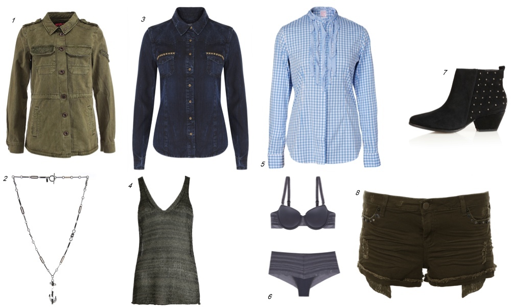 1/ Хлопковая куртка, Only, 2640 руб., www.lamoda.ru; 2/ Металлическое колье, Jean Paul Gaultier, 25 000 руб., Jean Paul Gaultier; 3/ Рубашка из денима, Marks & Spencer, 1699 руб., Marks & Spencer; 4/ Топ из хлопка и вискозы, Zadig & Voltaire, 10 105 руб., Zadig & Voltaire; 5/ Хлопковая сорочка, Gugliel Minotti Archivio’67, 5879 руб., Firmato & Scontato; 6/ Бюстгальтер и трусы из микрофибры и эластана, Сhantelle, 3880 и 1570 руб., «Эстель Адони»; 7/ Замшевые ботильоны с металлическими заклепками, Topshop, 3499 руб., Topshop; 8/ Хлопковые шорты, Calzedonia, 1300 руб., Calzedonia