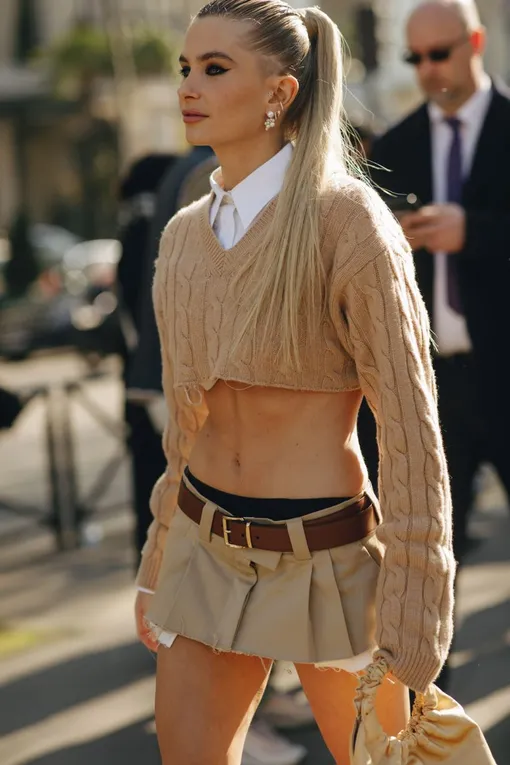 Стоит присмотреться к шерстяным мини-свитерам плотной вязки — в 2024 году будут актуальны модели с вертикальными «косами». Если вы предпочитаете более лаконичные варианты, предлагаем обратить внимание на короткие и тонкие свитеры-водолазки. Трендовый микросвитер должен быть до середины ребер со свободным краем — он считается наиболее универсальным, так как его можно носить поверх других элементов гардероба.