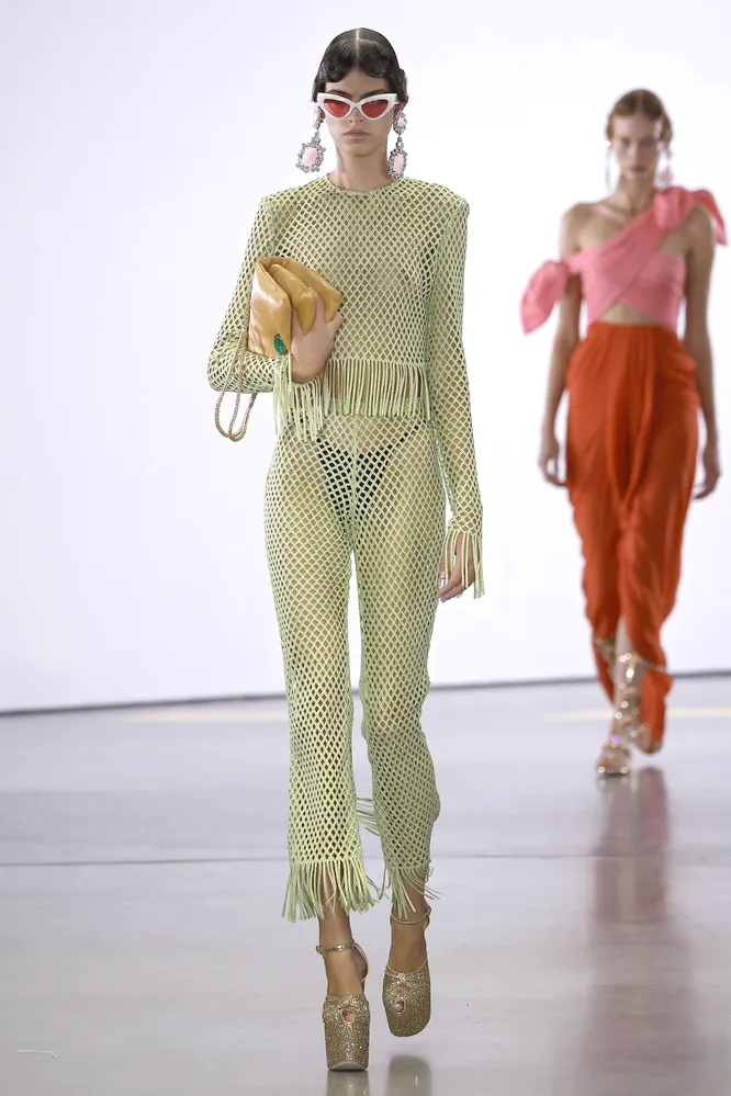 Пикантный образ зависит не только от разрезов и прозрачных тканей — иногда даже дополнительный слой может в корне изменить настроение. Представьте себе базовое платье-комбинацию или лук с джинсами и майкой-алкоголичкой — это проверенные варианты, но, будем честны, слегка скучноватые. Если в аутфит добавить асимметричный джемпер-сетку или плетеный пояс, то сразу получится модная иллюзия — захочется рассмотреть, что же скрывается под ними. Носить такие модные вещи на лето-2023 можно в любую погоду — крупная вязка в этом плане очень комфортна.