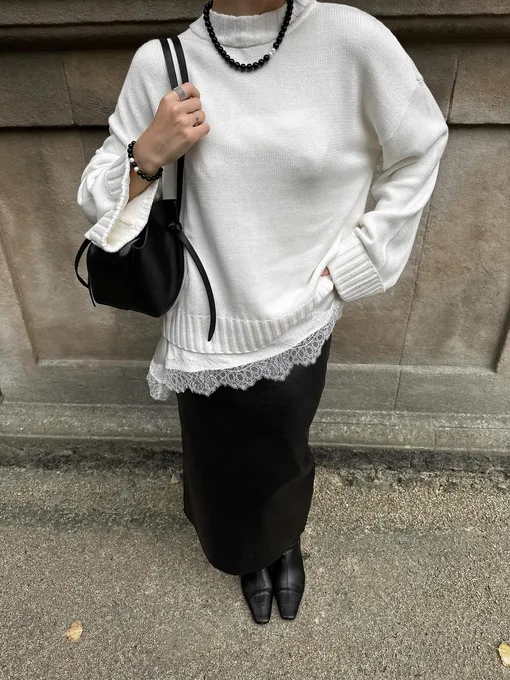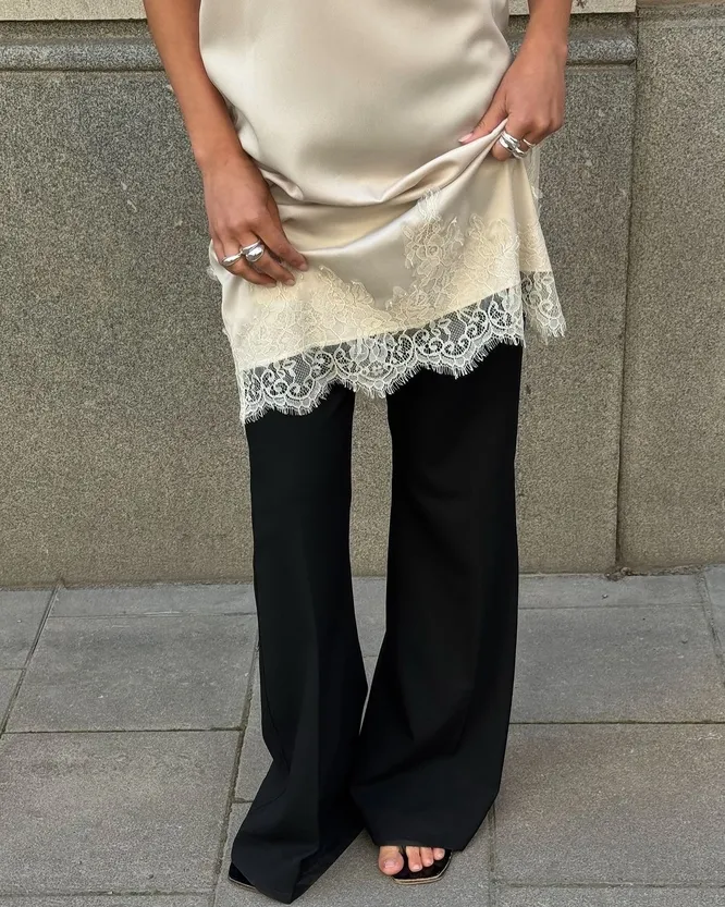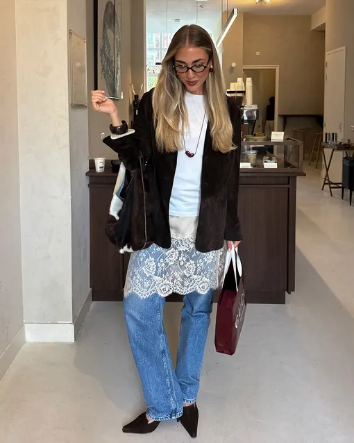 Обратите внимание: речь именно о коротких юбках, а не о миди или макси. Да, в интернете в большом количестве встречаются фотографии аутфитов с такими моделями, но они уже устарели. Вам нужно выбирать именно мини — изделие должно закрывать либо верхнюю треть, либо половину бедра. Само кружево может быть как достаточно плотным, с выраженным рисунком, так и очень легким, почти невесомым. Допустимы и решения из атласа или шелка с ажурной отделкой по подолу. Цвета — практически любые, хотя базовый белый и молочный всегда остаются беспроигрышным вариантом. Идеально, если юбка будет сидеть по фигуре, но не обтягивать, — лучший выбор модель А-силуэта или прямого кроя. Носить такие изделия следует исключительно поверх джинсов и брюк. Причем сочетать их рекомендуем не со скинни, а со свободными моделями.