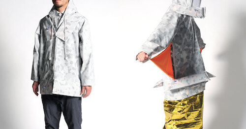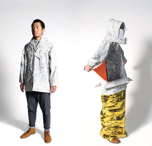 В капюшоне – фильтр для дыхания, воротник и карманы надуваются в спасательные круги, в рукаве прячется нож, а на спине – бинты. Подкладка же разворачивается в одеяло из золотой фольги – замерзнуть невозможно!