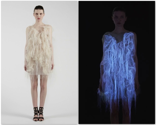 Очевидное-невероятное – изобретено платье, оживающее, когда на него смотрят! Йинг Гао придумал наряд, снабженный специальными сенсорами, распознающими человеческий взгляд – затейливые складки и бахрома начинают причудливо вздрагивать и колыхаться. А в темноте они еще и светятся – просто чудеса!